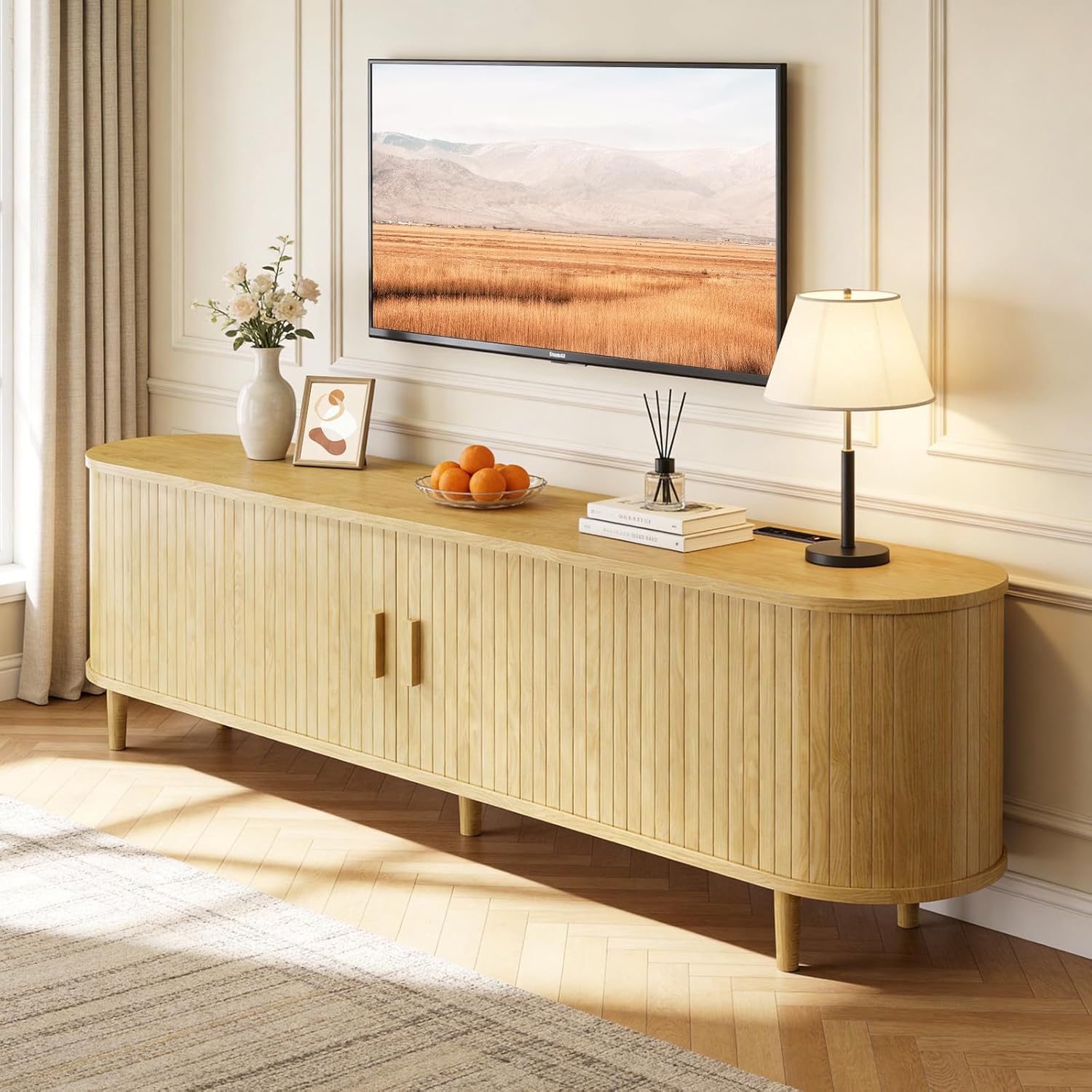 Blending mid-century modern charm with contemporary functionality, this fluted TV stand features smooth sliding doors and a rich walnut finish that adds warmth and character to any living space. The quiet-glide track system allows effortless access while maintaining a clean, streamlined appearance. Designed for convenience, the built-in power station includes 2 AC outlets, 1 USB port, and 1 Type-C port to keep your TV, gaming console, and media devices powered and organized. A rear cable management hole helps conceal cords for a tidy setup. Multiple storage compartments and adjustable shelves with three height levels provide flexible space for electronics, books, décor, and everyday essentials, while hidden side storage keeps clutter out of sight. Easy-to-follow instructions and labeled parts ensure quick and straightforward assembly.