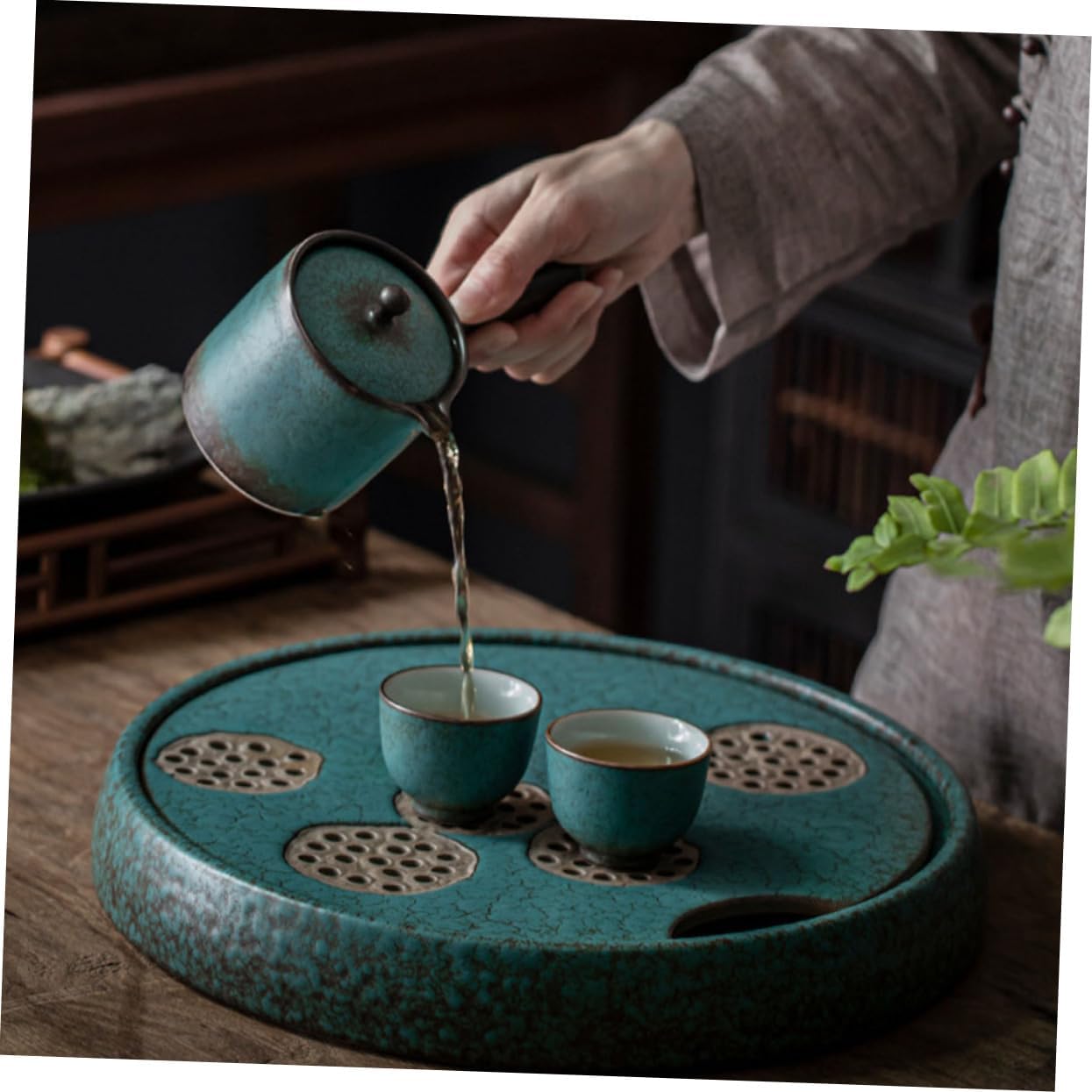 Package Include 1 x Tea Tray Characteristics -Material: Ceramic Ceramic Teapot Tray -Color: Green Ceramic Storage Plate -Size: About 31.00X31.00X4.00cm/12.18X12.18X1.57in Tea Tray - Made of material which will never crack Household Desktop Decoration. - Thick and , thus it is not easy to crack Ceramic Storage Tray. - craftsmanship, no burrs, smooth hand feel Vintage Teapot Coaster. - It can store tea accessories and drain water at once Convenient Teapot Tray. - It is creative and in use Wear-resistant Teapot Goods InformationTea Kettle Tray With creative draining hole design, easy to drain out overflowed tea from cups.Wear-resistant Teapot Plate Suitable for home, tea house, living room, office and other places.Vintage Teapot Coaster This product has storage and drainage dual-purpose design, very