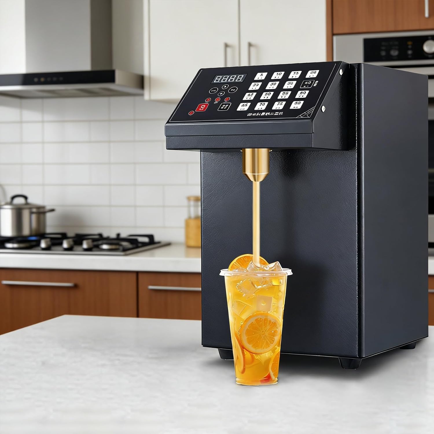 This commercial automatic fructose dispenser is designed for efficient beverage preparation, ideal for milk tea stores, coffee shops, restaurants and other commercial venues. Built with sturdy stainless steel material, it ensures durable use and easy cleaning, while the food-compatible containers and tubes support safe daily operation. The user-friendly microcomputer control system offers simple operation and multiple adjustable settings to meet various dispensing needsWith a spacious interior and reliable performance, it provides consistent and accurate syrup output for daily drink making. The compact structure saves counter space and supports smooth long-term use, making it a practical and efficient tool for beverage shops. The stable operation system helps maintain steady syrup flow and reduces unnecessary waste during use. Its thoughtful design includes easy-to-operate controls and a reliable structure that stands up to frequent daily use in busy commercial environmentsThe smooth surface and detachable components simplify routine cleaning and maintenance, helping to keep the working area tidy and hygienic. This reliable syrup dispensing machine effectively improves drink preparation efficiency, bringing convenience and consistency to any beverage-making business. It features a stable and practical structure that fits well on most countertops, making it a great addition to any busy drink preparation area. The intuitive operation allows staff to use it with minimal learning, helping to speed up service during peak hours. The dependable design minimizes disruptions and ensures consistent performance throughout daily use, supporting smooth workflow and high-quality beverage production. With its combination of durability, efficiency, and user-friendly design, this dispenser is an excellent choice for businesses looking to enhance their drink-making process
