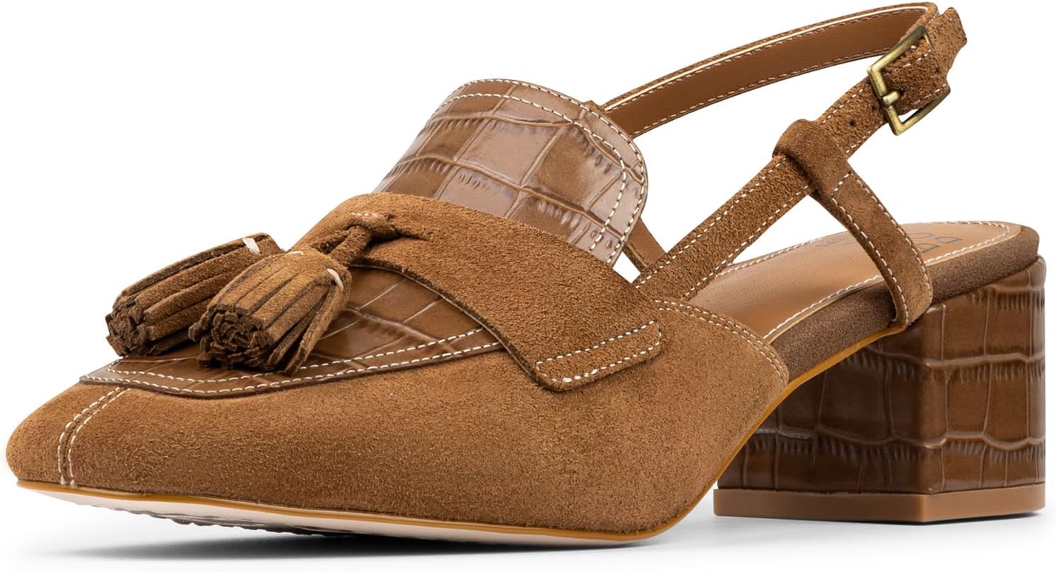 The Kudos slingback brings a classic tassel loafer look to a bold new shape. Set on a low block heel, this slingback style features a squared toe and adjustable buckle strap with elastic for a secure fit. The flexible sole of this dressy women’s heel gives you room to move. An extra padded memory foam insole offers unbeatable comfort to your long events or workdays. Donald Pliner designs not just these Kudos slingback loafers for women, but all our products with the quality and care that comes from more than thirty years of passion in the business.