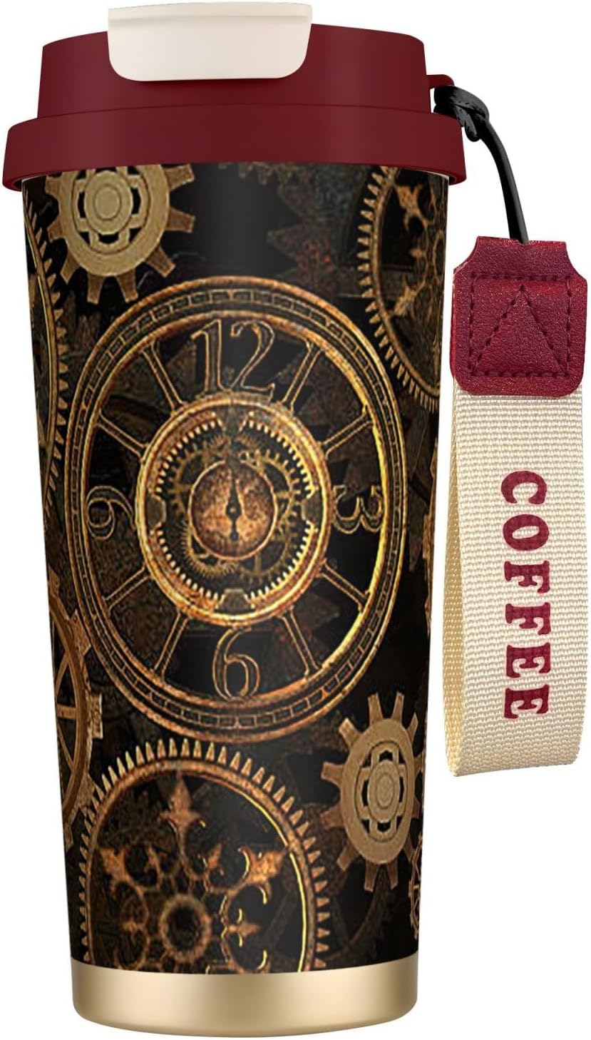 This Gears Clock Bronze Century Print travel Coffee Mug supports three drinking modes: the direct drink spout for quick drinks during commutes, the straw port for iced coffee and other spill prone beverages, and the open top design that replicates the traditional coffee cup experience. BPA Free 316 Stainless Steel, Safe and Durable Inner liner made of food grade 316 stainless steel, non toxic, odorless, BPA free, safe for long term use.