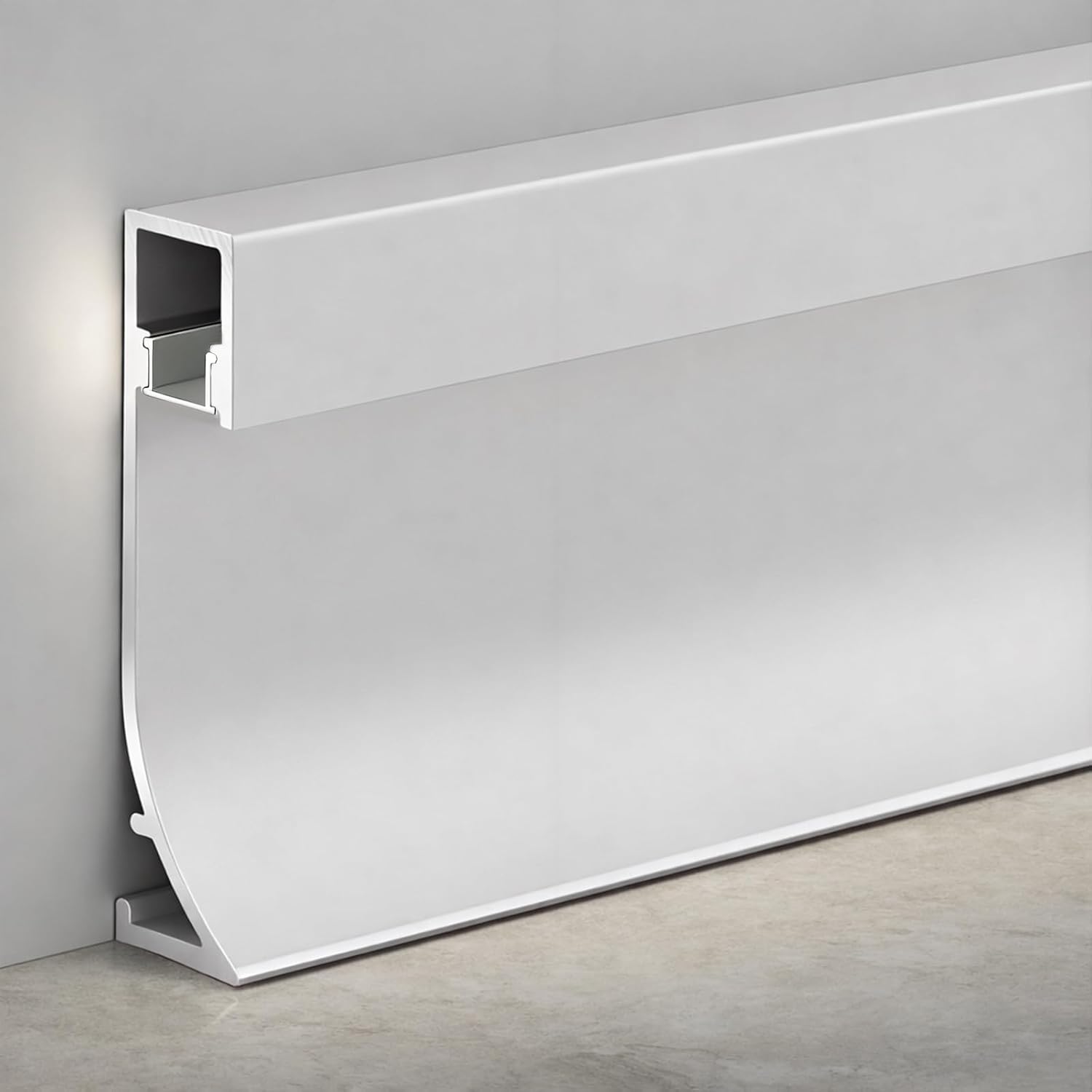 Product Description Upgrade your interior with this LED-ready aluminum baseboard molding, designed for modern spaces that value both aesthetics and functionality. Unlike traditional baseboards that require drilling or nails, this metal skirting board is installed using nail-free construction adhesive, offering a clean and secure solution without damaging finished walls. (Adhesive not included.) The integrated LED channel allows you to add your own LED light strip (sold separately), creating soft, indirect illumination that enhances room ambiance without glare. The aluminum construction ensures excellent heat dissipation and long-term durability. Perfect for residential and commercial applications, this baseboard trim not only enhances lighting design but also protects walls and conceals floor gaps for a polished, professional finish. Specifications Material: High-quality 6063-T5 aluminum alloy Process: Anodizing treatment Color: Available in multiple colors to perfectly match your home décor style. Height: 50mm, 80mm Length Options: Available in 1.2m, 2m, and 2.5m lengths Installation: Adhesive (No Drilling) LED Strip: Not Included Accessories: Connecting accessories will be included according to the total length of the baseboards you choose.