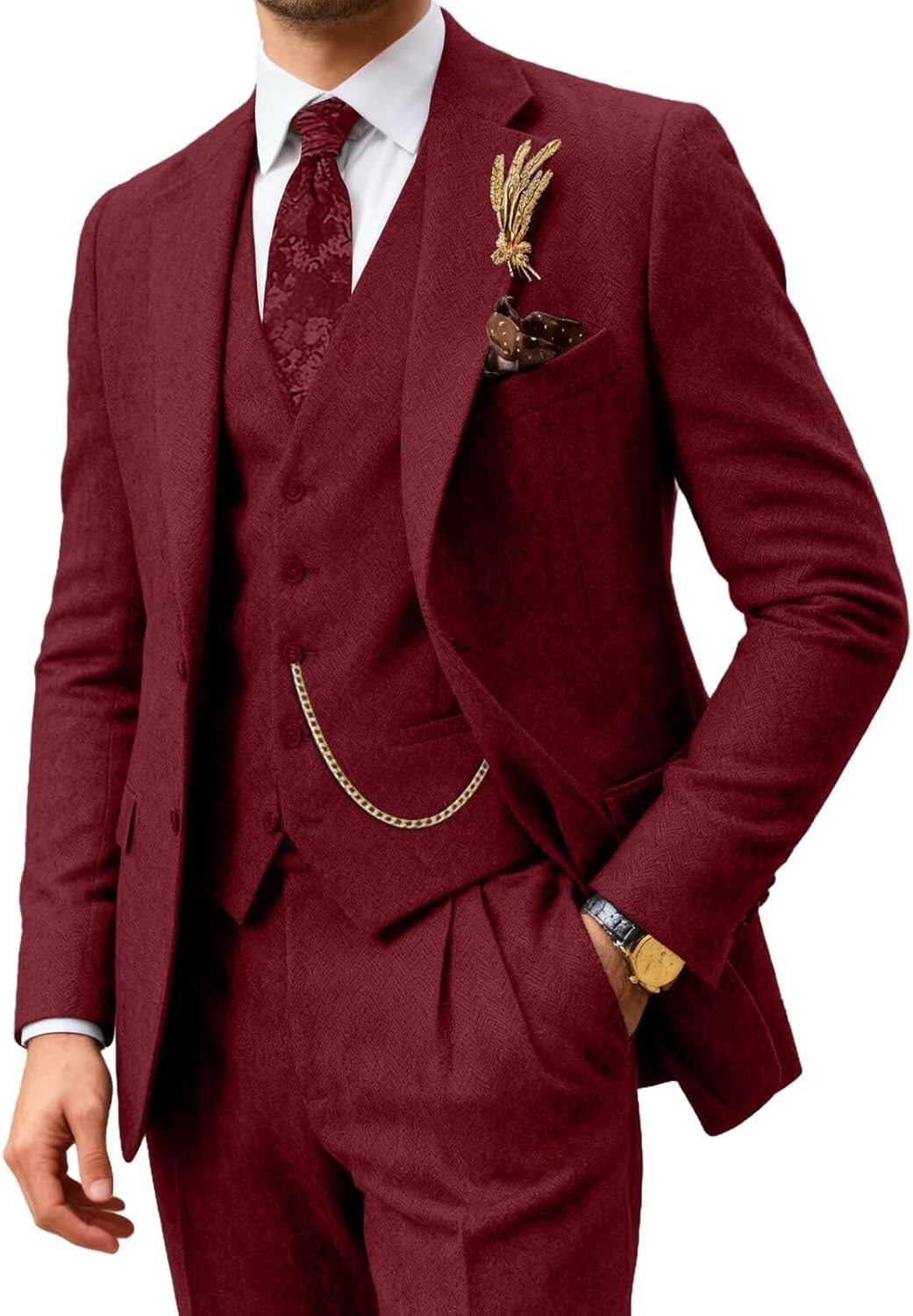 Notifications Please choose right size according to our size chart. Package includes:Jacket + Pants +Vest Fabric:70% Polyester,20% Rayon,10% Wool Fit:Slim fit Elasticity:No elasticity Thickness:Moderate Size:X-Small,Small,Medium,Large,X-large,XX-Large,XXX-Large. The Tweed Suits featured with Polyester fabric, gives you more noble disposition. Single-breasted two button closure, notched lapel perfectly present your gentility. Please note: 1. Color Difference: Please be aware that colors might look slightly different in person due to camera quality and monitor settings. 2. Commodity Index: it is normal thickness, inelasticity, moderate soft and slim fit. 3. Multi Occasions:Great for both formal and casual occasions -business, presentation,party, events, celebration, prom, banquet, show, dancing, dates, graduation
