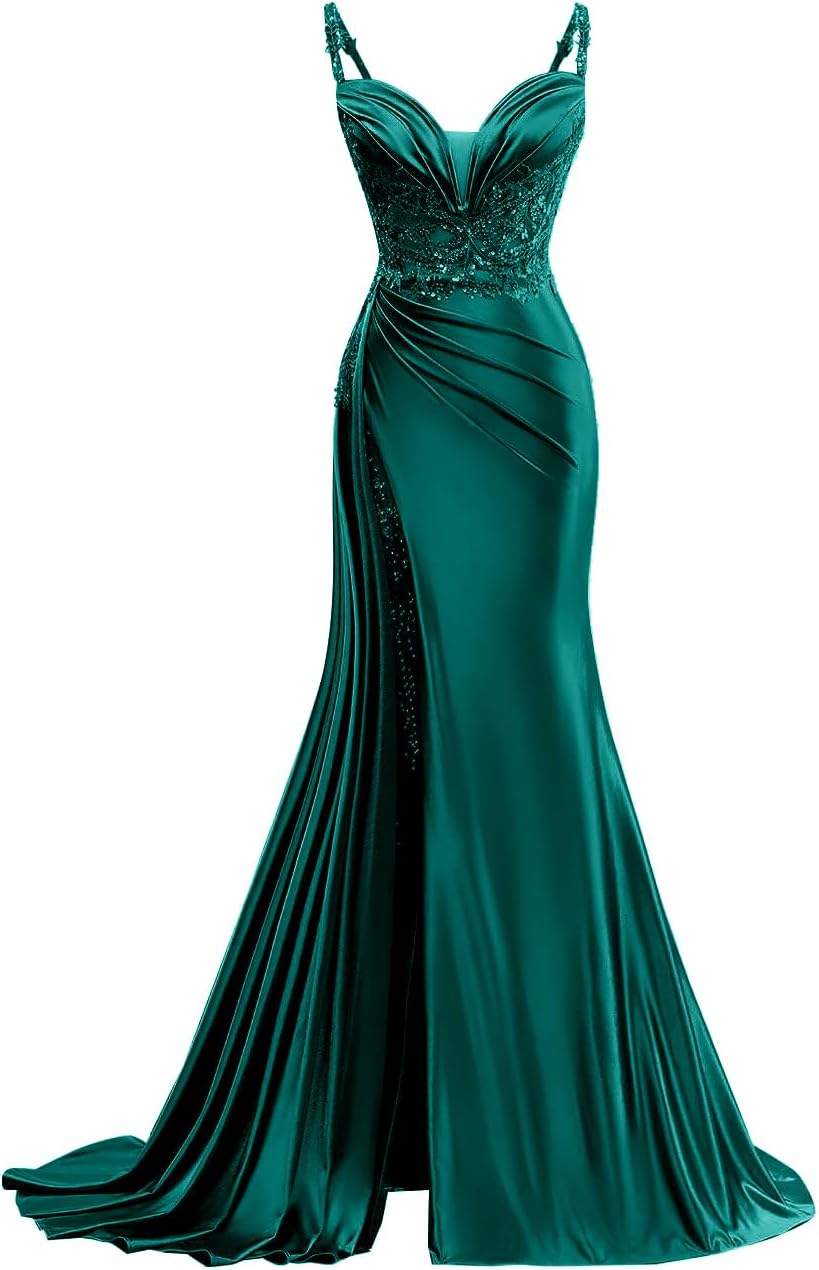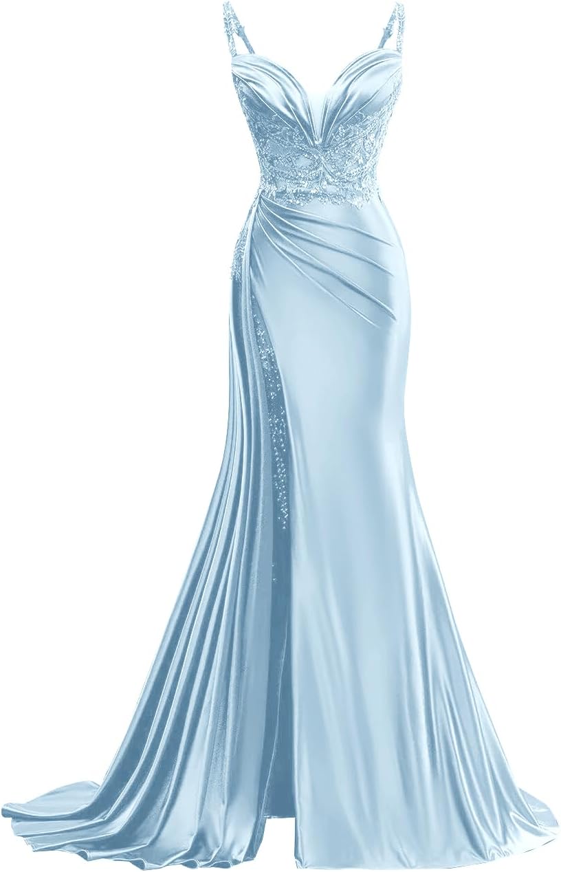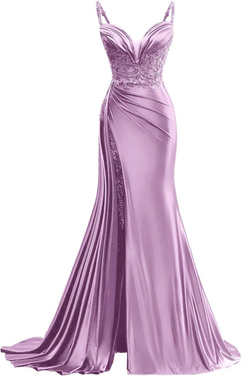 Welcome to XsqmbwbWe wish you to be able to choose a beautiful dress that suits you.We will provide you with bridesmaid dress,evening dress,prom dress,homecoming dress,cocktail dress,wedding dress.the business philosophy of our store is to provide customers with satisfactory products and services,to become customers' friends,not just for sellersDress DetailFabric:Satin Feature:Spaghetti Strap Satin Prom Dress for WomenV Neck Pleated Long Party Dress with TrainLong Sequin Applique Formal Evening GownLace Up ClosureSpaghetti strap,v neck,sequin applique,pleated,built in bra,side slit,with train,long formal evening party gownHow to choose size:Please refer to the size chart on the left side of the product page to select a size. Pay Attention! ! ! If you are not sure which size to choose,you can choose One Size,One Size in our store represents customized size,if you need to customize, please send us your measurement details as list:1.Full Bust _____ inch or ___ cm2.Waist _____ inch or ___ cm3.Hips _____ inch or ___ cm4.Shoulder to Shoulder ____ inch or ___ cm5.Hollow to floor (Shoulder to Feet without shoes) ___ inch or ___ cm6.The height of heel shoes: _____inch or ___ cm7.The date you need the dress:____Notes:1.Due to the difference of the display, please allow a slight color difference between the received dress and the picture2.Please allow 1-3cm differs due to manual measurement.