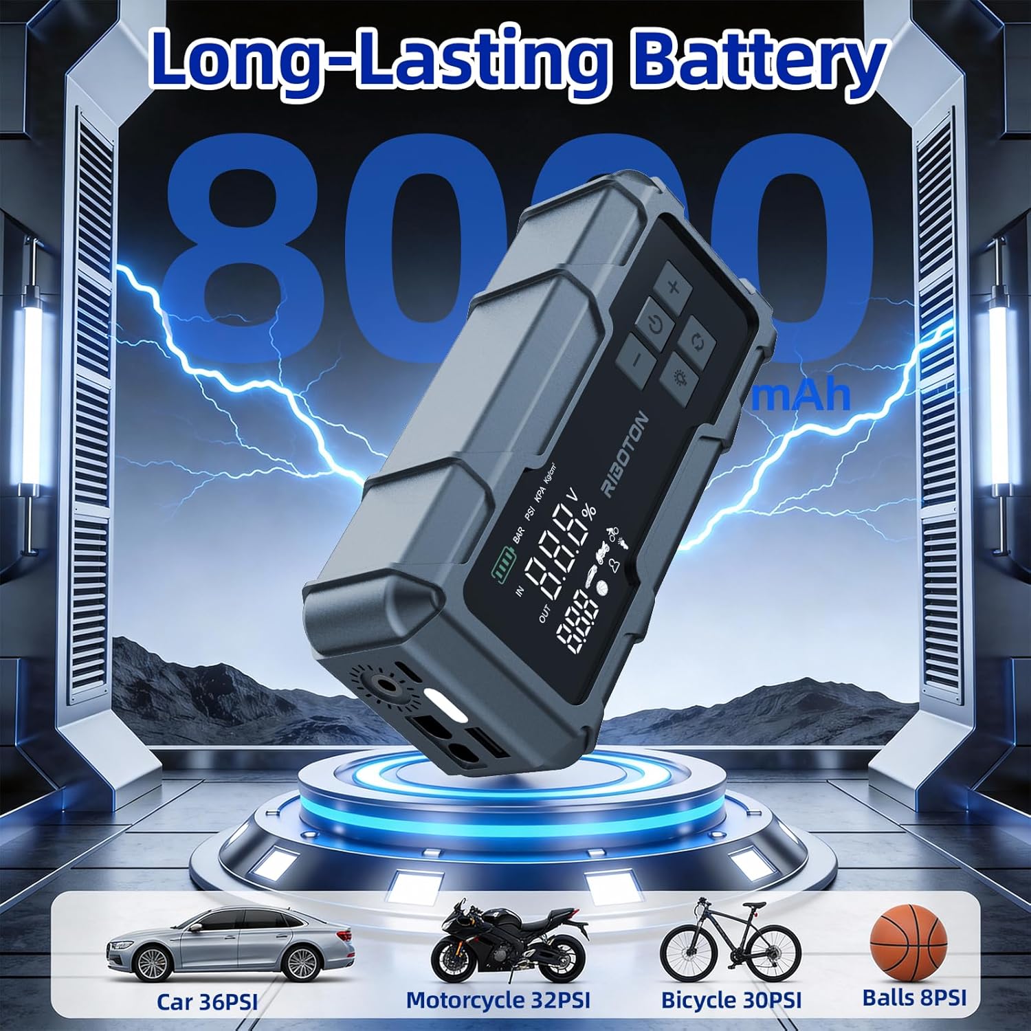 Hlporvxdrv All-in-One Car Emergency Jump Starter & Tire Inflator P108 Stay prepared for any roadside emergency with our 2-in-1 car jump starter and tire inflator—your ultimate travel companion for daily commutes, winter driving, and road trips. This jump starter delivers reliable performance to revive dead car batteries in seconds, powered by a high-performance 4*2000mAh polymer battery. The built-in 19-cylinder 390 motor inflates tires efficiently with 21L/min airflow. It features multi-mode precise inflation with a dual-mode large screen display, showing real-time pressure and battery status at a glance. Designed for convenience, the air pump doubles as a 5V2A power bank to charge your electronic devices on the go. Its mirror-screen horizontal design, independent battery level indicator, and soft side-emitting light enhance usability in low-light conditions. The compact, portable build (170*71*65mm, 590g) and complete accessory kit (including air hoses, smart clamps, and inflation nozzles) make it ideal for cars, motorcycles, bicycles, and sports equipment. Whether you’re tackling a flat tire, a dead battery, or need emergency lighting, the air pump ensures you’re never stranded.