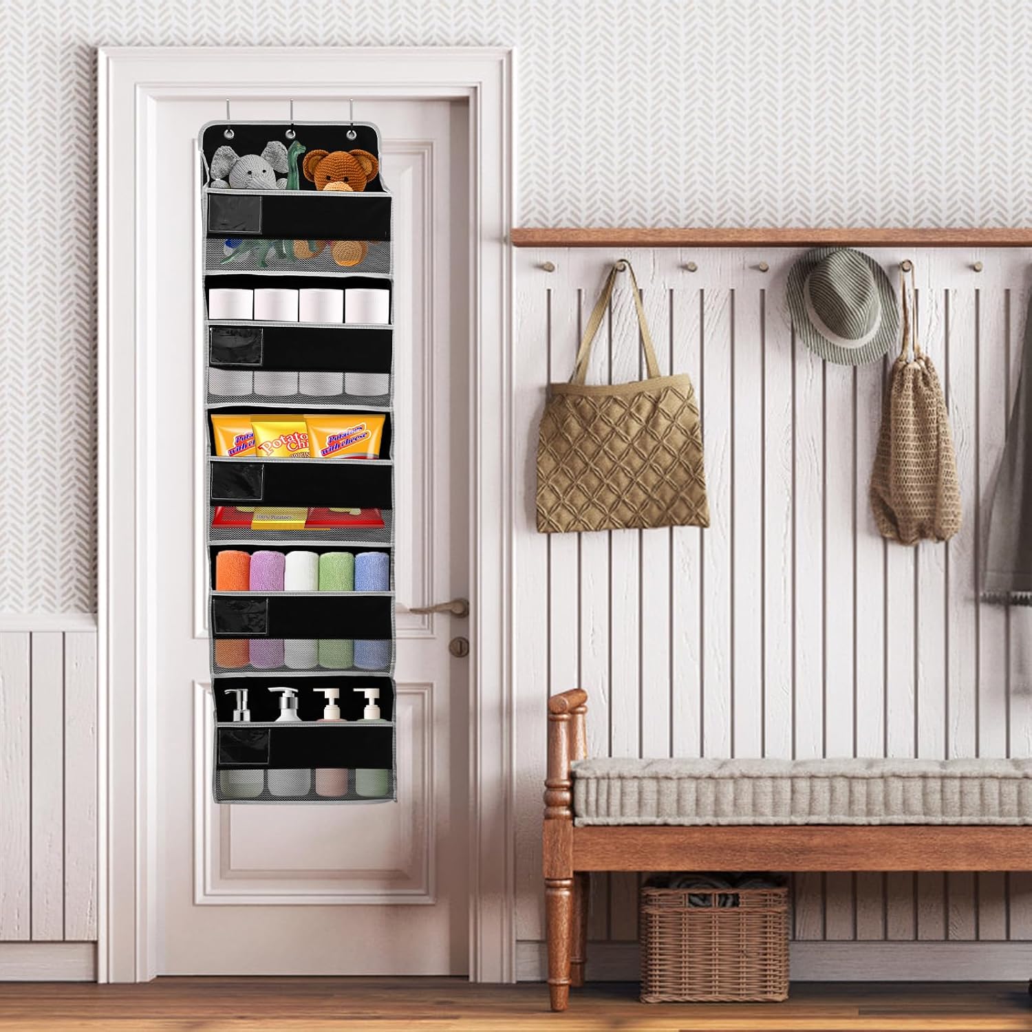 Parts List:1 x grey five-layer hanging bag +3 x hooks1 x black five-layer hanging bag +3 x hooksProduct Specification:Description:It adopts the double-layer non-woven fabrics, which are odorless and safe for people. The front, sides and bottom of the door hanging bag have cardboard, which can hold its shape well, so that it will not deform or tilt when it load the heavy objects. It is also can be rinsed directly with water or wiped with a wet paper towel. Our behind door hanging bags are designed to meet your multiple storage needs.Key Feature:Convenient Design: Its storage transparent grid +pvc label pocket design, let you know exactly what is put in each layer and help you save time rummaging pockets as well as let you quickly find and distinguish what you need.Large Capacity: The hanging bag has 10 mesh side bags and 5 layers of spacious storage bins. And every layer has a clear mesh window and a small PVC transparent pocket that can be inserted into the label for easier access.Specification:Product Name: Hanging Storage OrganizerMaterial: non-woven fabric +PVC+ cardboardDimensions: 39 x 17 x 145 cmNote:1. There may be slight color differences between the product picture and the actual item. We will do our best to display the color as accurately as possible.2. Please allow slight dimensional discrepancies due to manual measurement.
