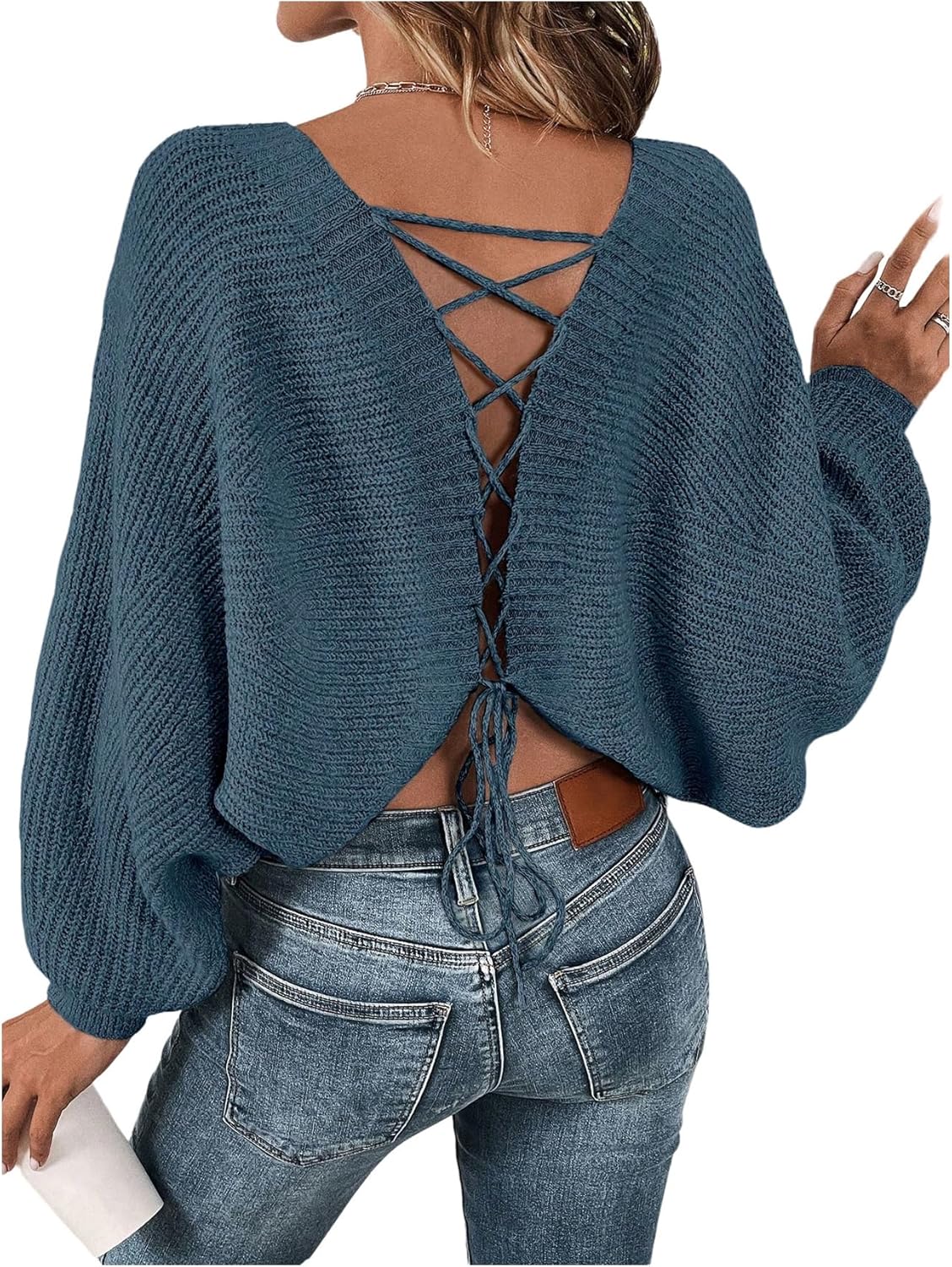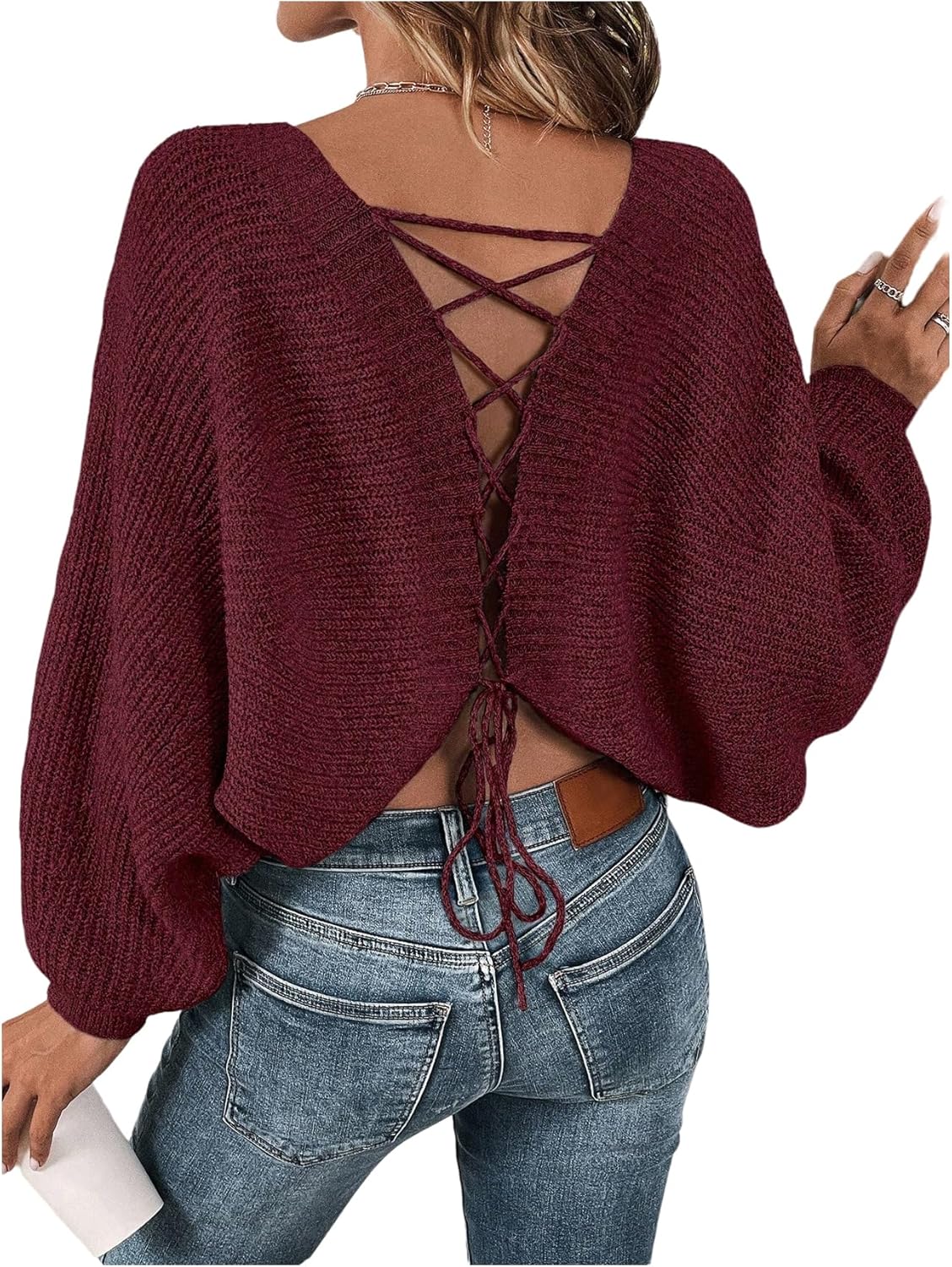 Women's Off Shoulder Lace Up Open Back Sweaters Long Sleeve Loose Pullovers Casual Knit Fall Tops